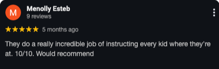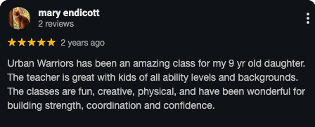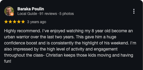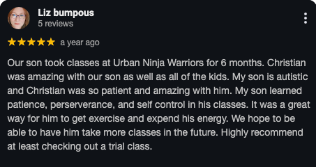 “Christian’s Urban Warriors Parkour classes have been incredible for my boys! He is so amazing with kids—I love his enthusiasm and patience...the way he engages with children and his overall positive attitude. It has helped my son gain confidence and positivity. I can’t thank him enough and we absolutely love his classes!”